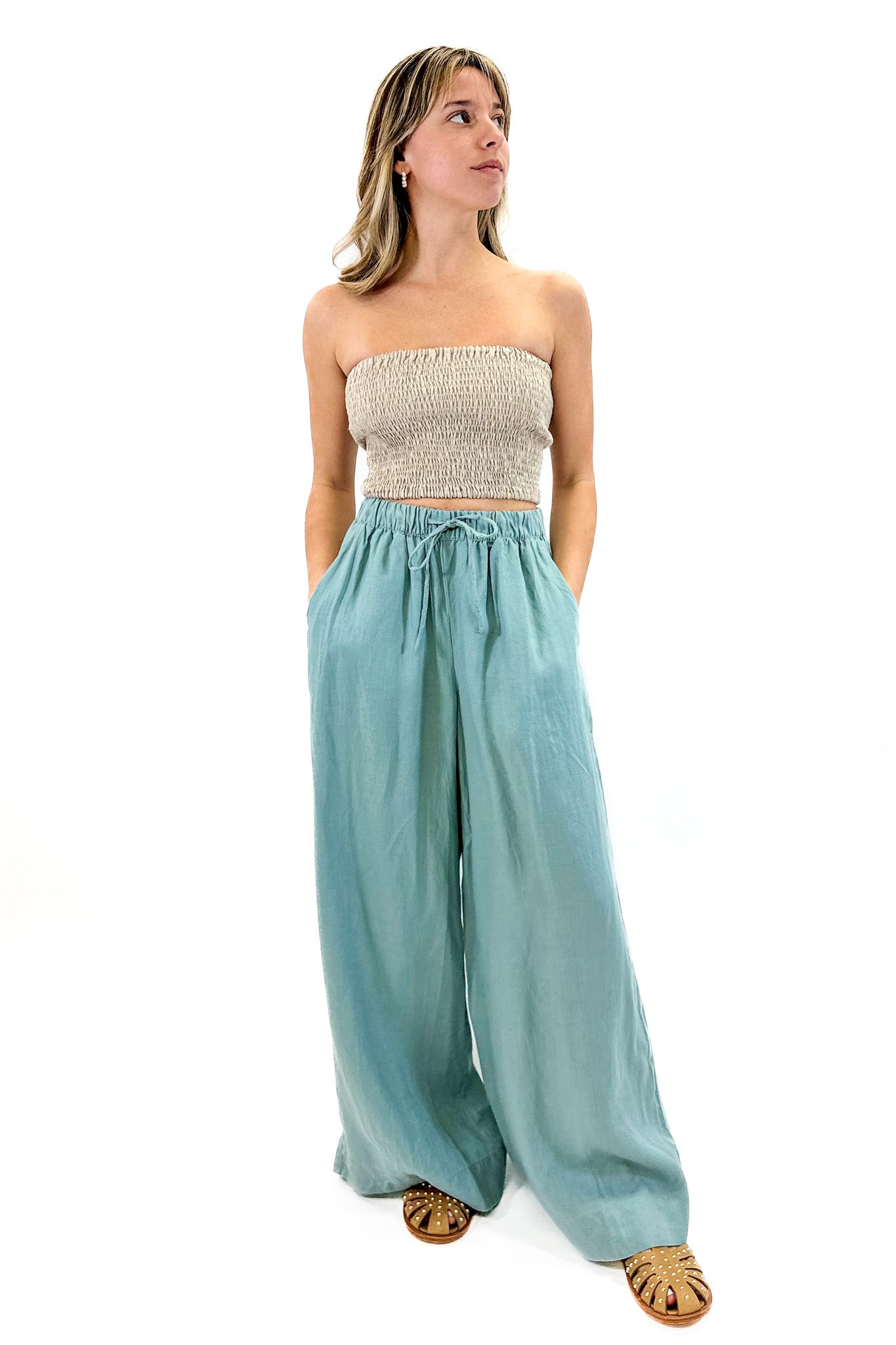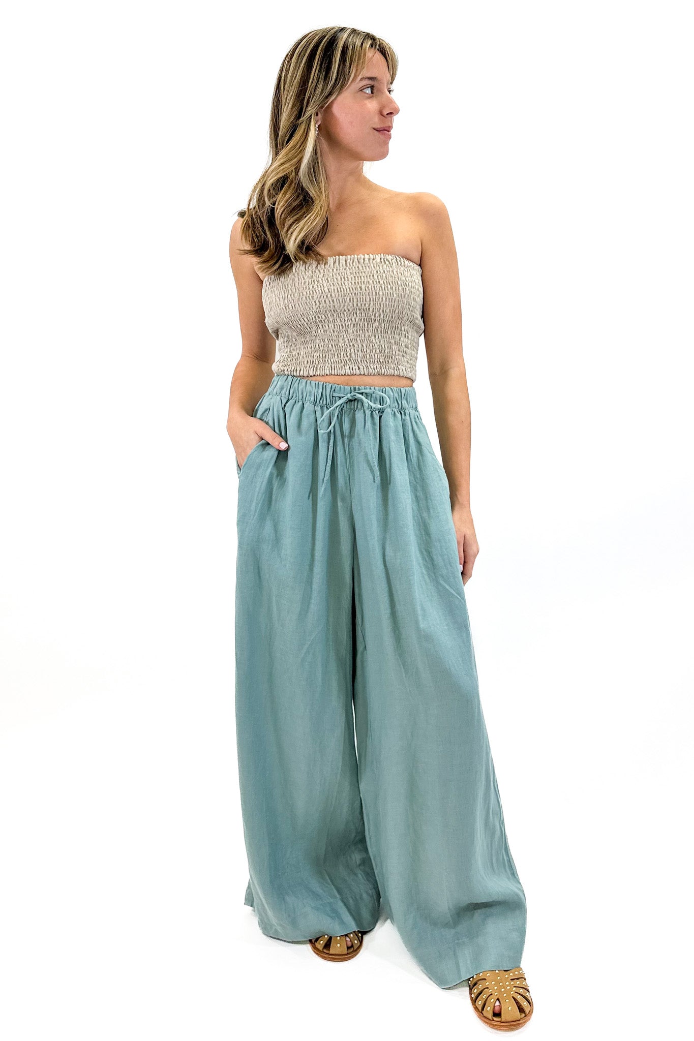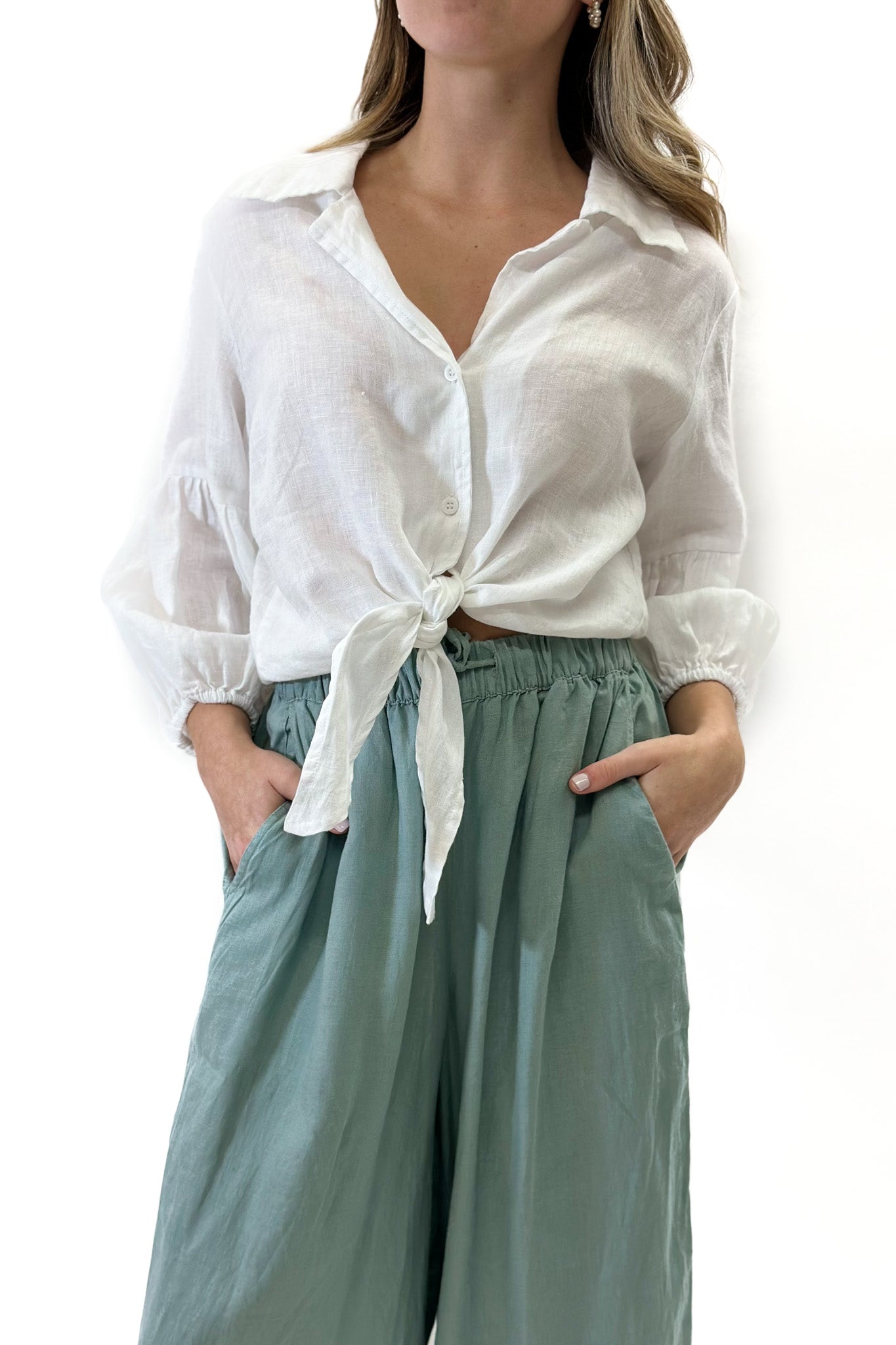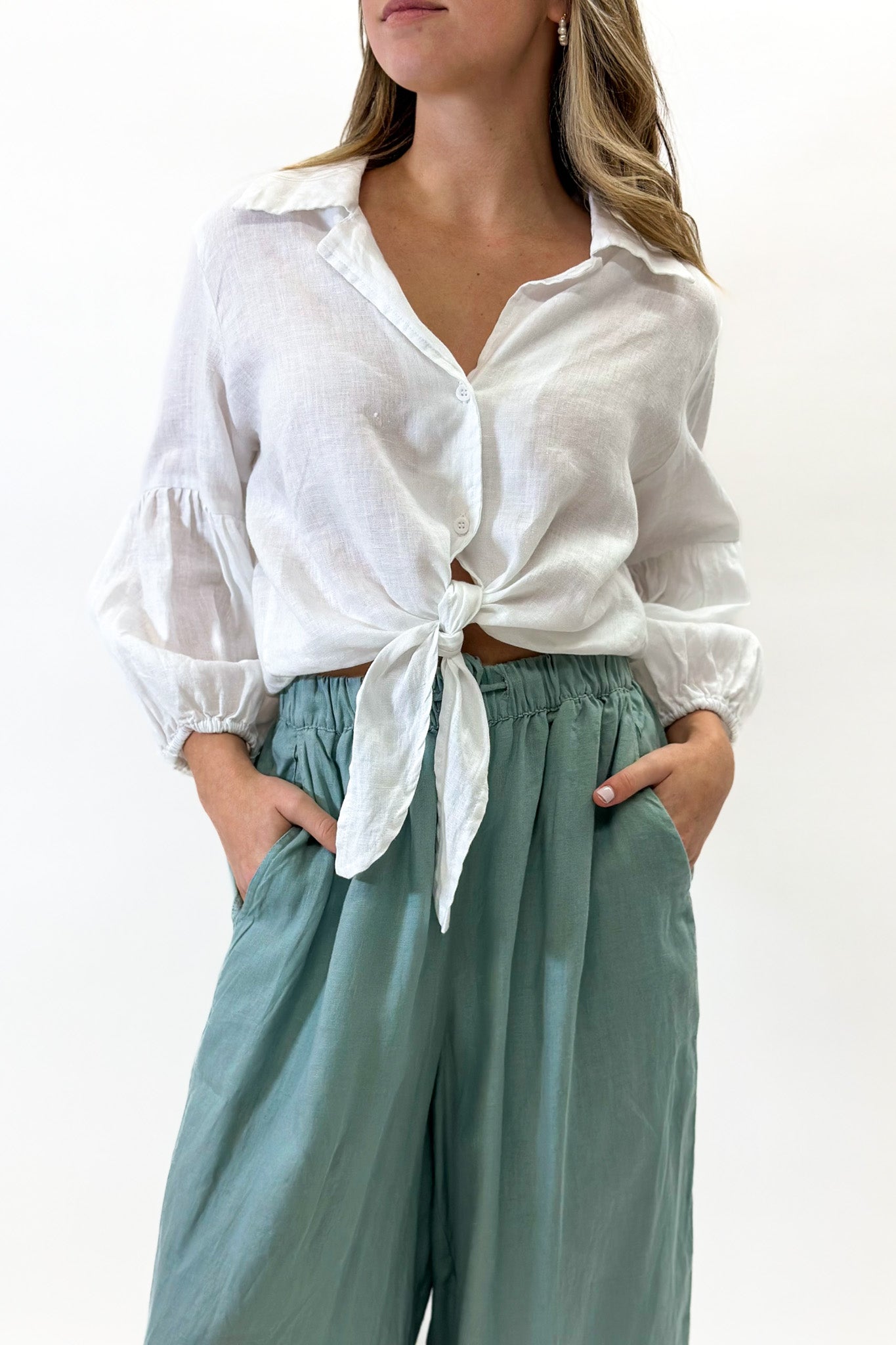 Shown with the Linen Bandeau in Natural and Ava Button Up in White