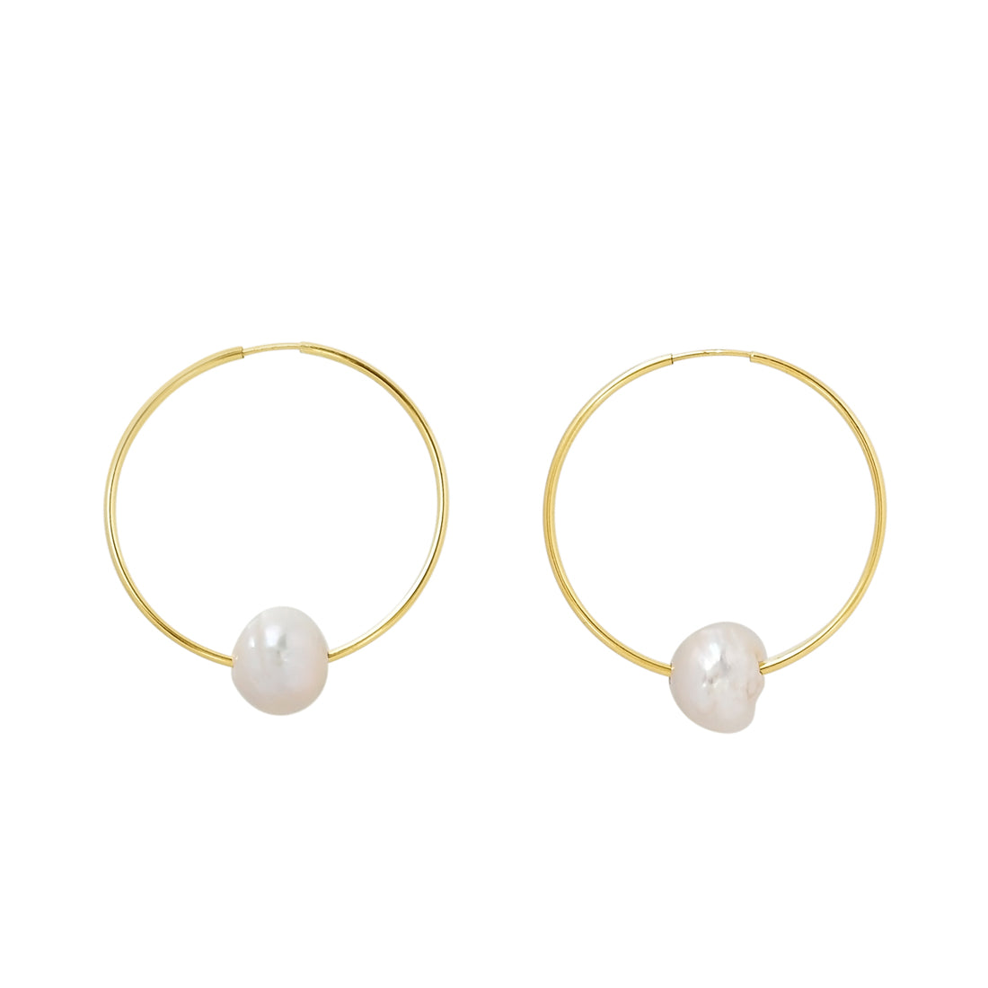 Each earring features a freshwater pearl floating freely inside a gold-filled hoop