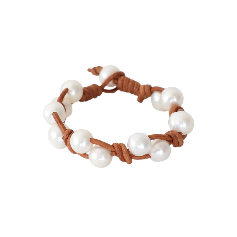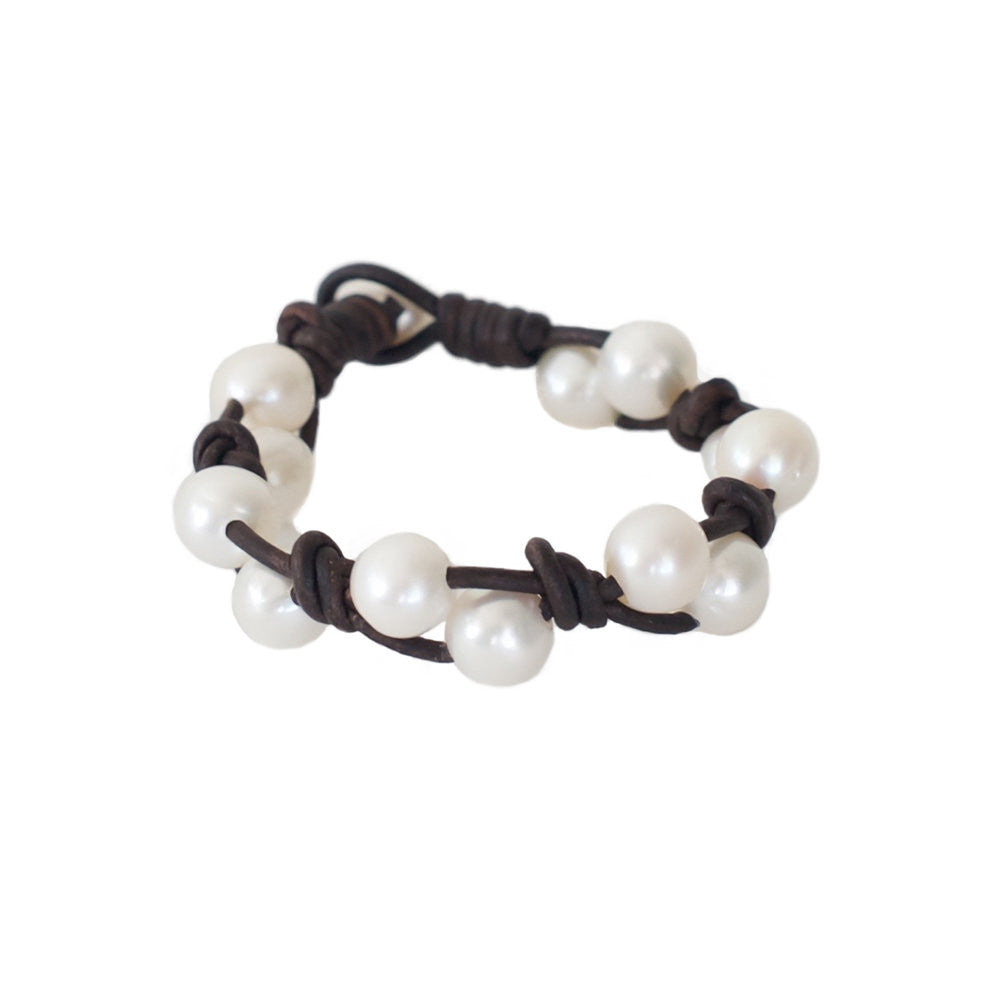 Features 10 mm - 11 mm freshwater pearls hand tied on naturally dyed leather