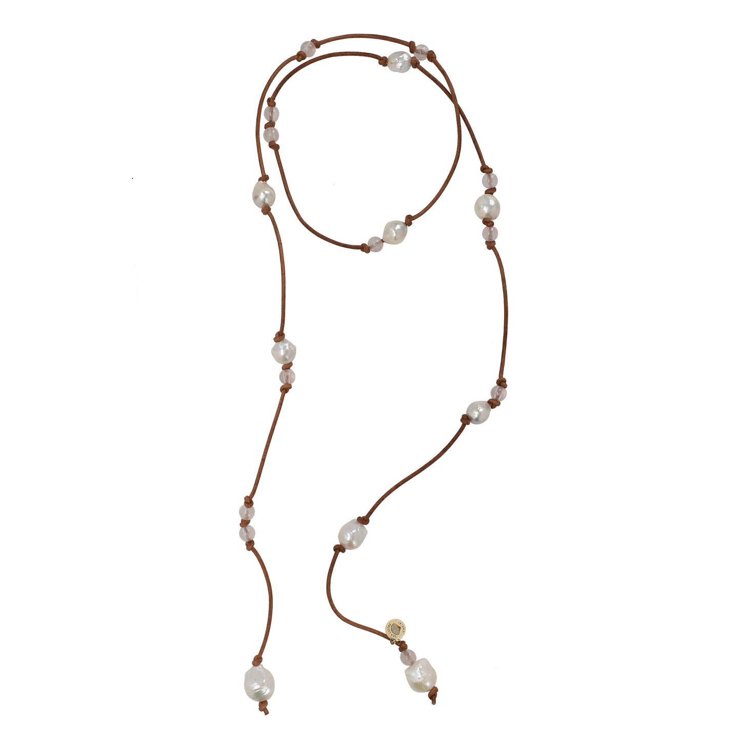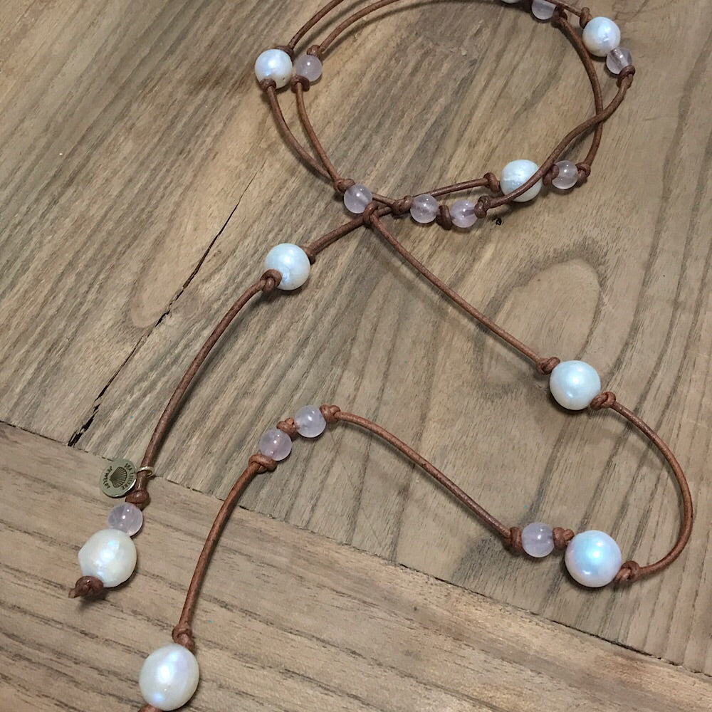 Features rose quartz gemstones and high luster freshwater pearls hand tied on naturally dyed leather