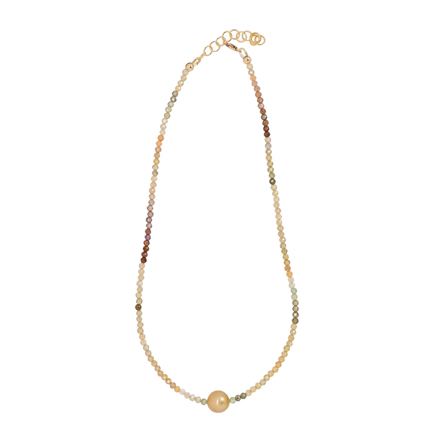 Naturally colored zircon gemstones (not to be confused with zirconia) with a single golden South Sea pearl