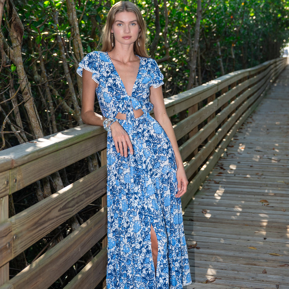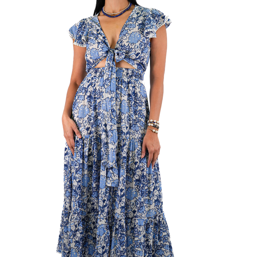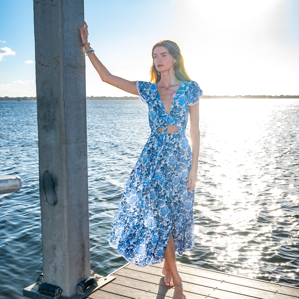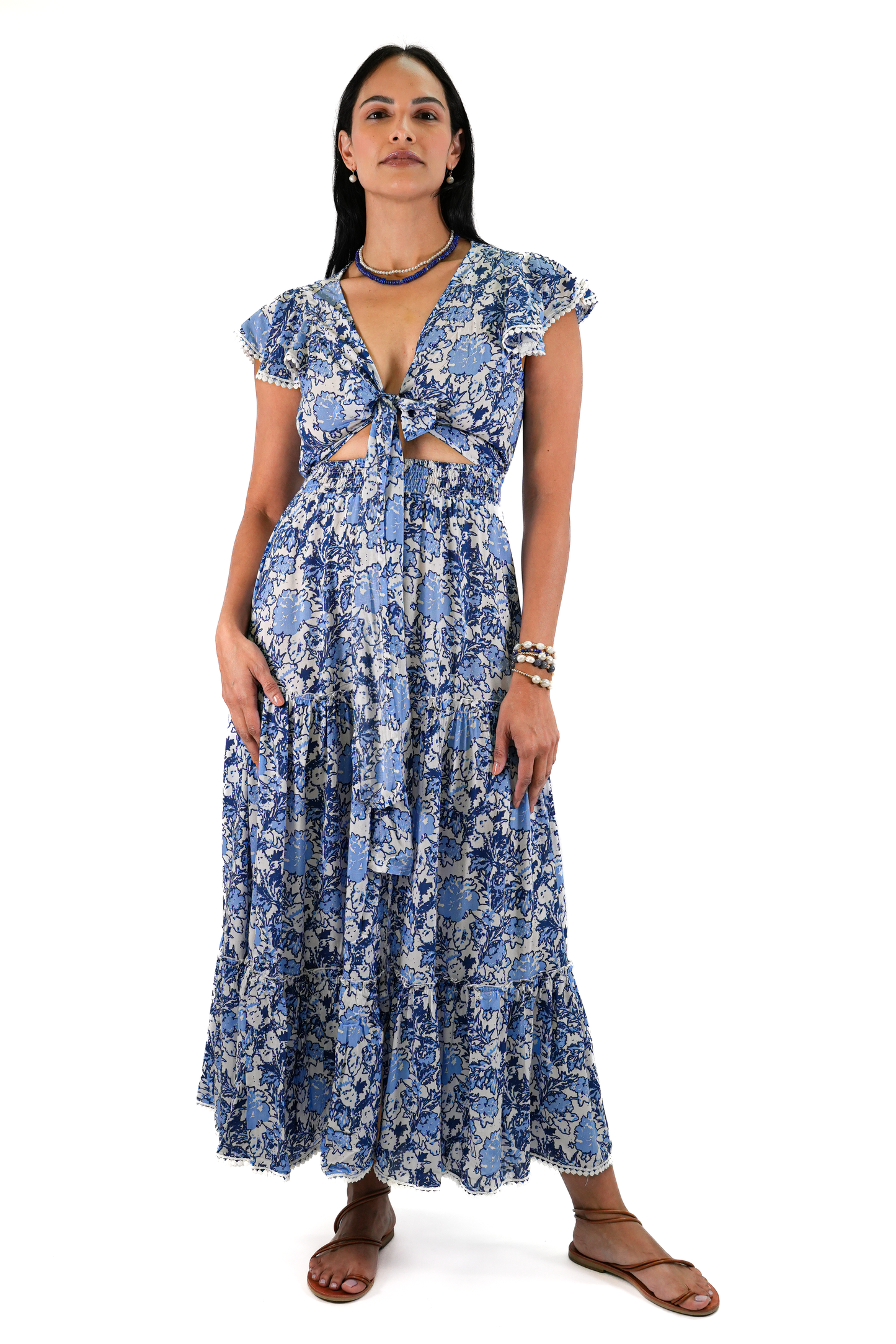 Wrap tie at bust that can be worn tied in the front or wrapped and tied in the back for fuller coverage