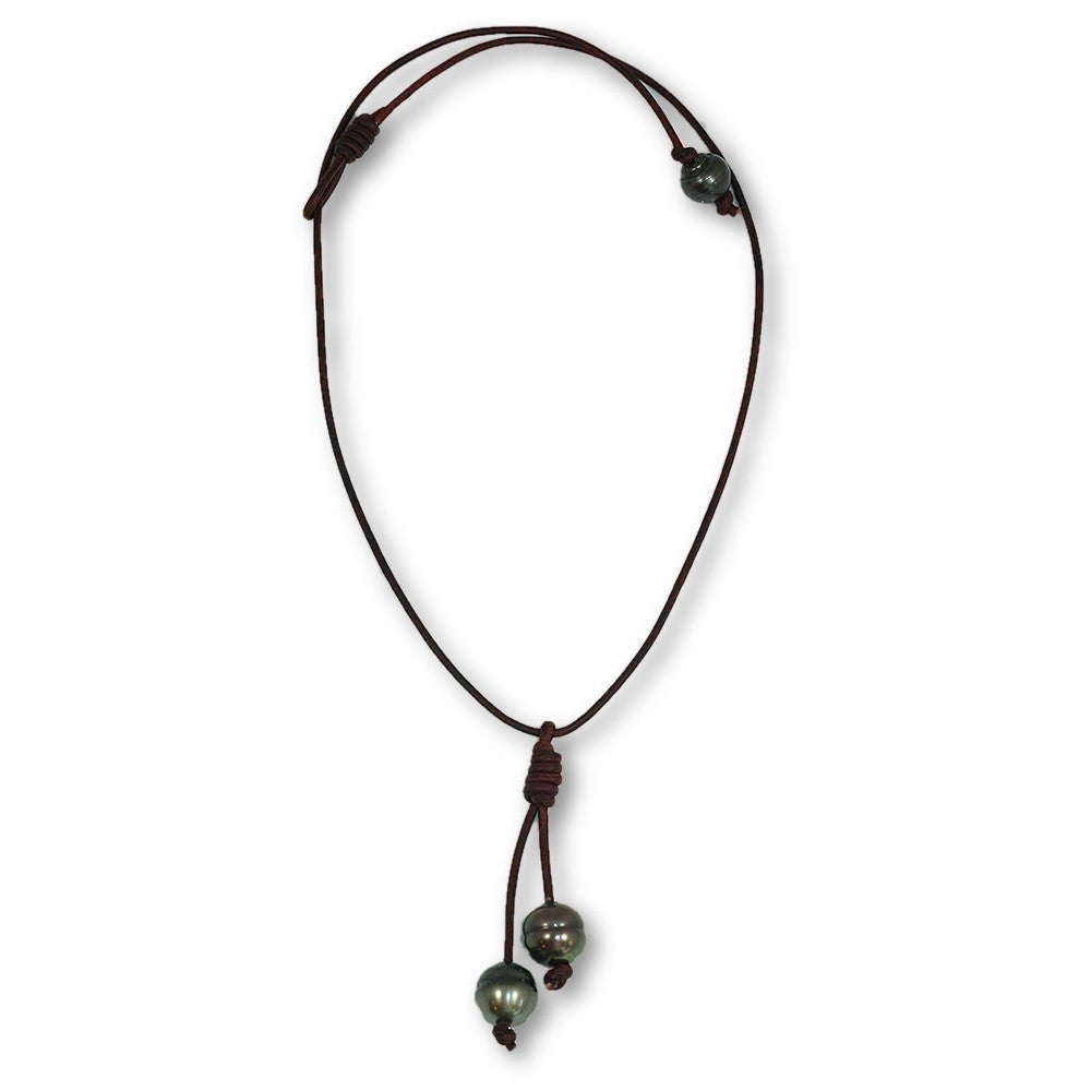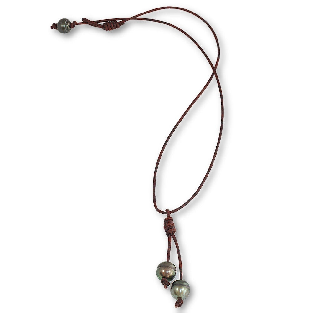 Features two Tahitian pearls hand tied on naturally dyed leather