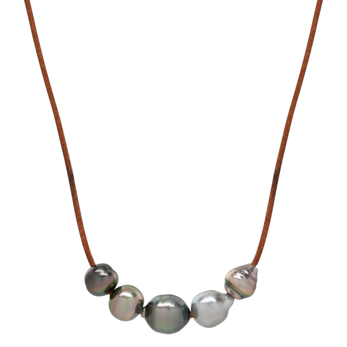 Features five Tahitian pearls hand tied on naturally dyed leather