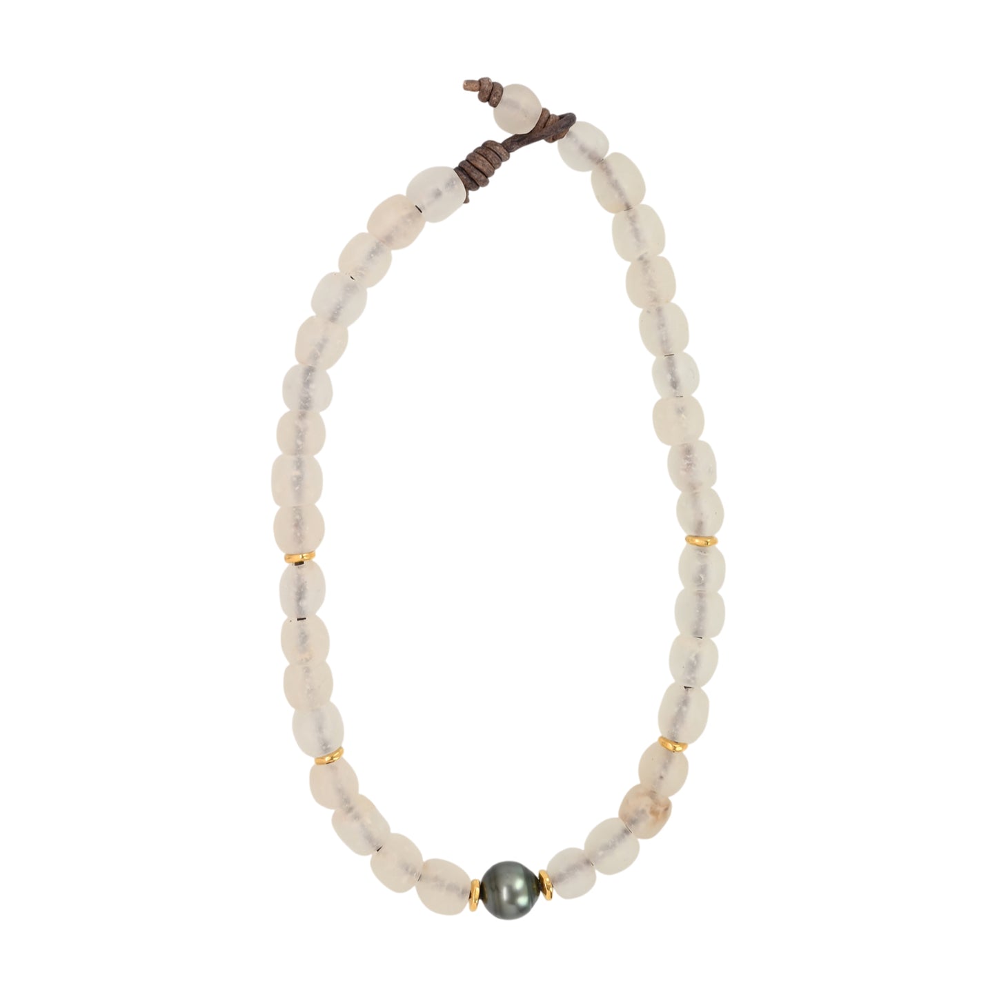 Features one high luster natural Tahitian pearl, frosted clear recycled glass beads and gold accents