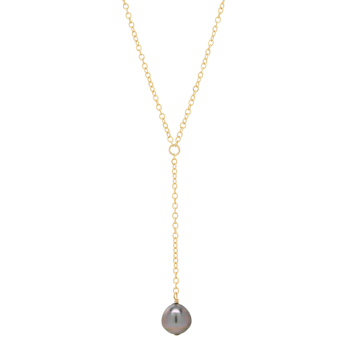 Gold-filled Y style necklace featuring a single high luster Tahitian pearl