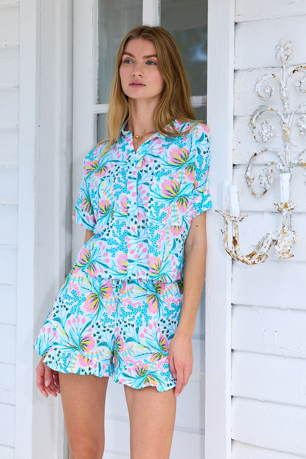 Shown with the Gemma Button Up in Sea Garden and Juno Button Button Up in White Cotton